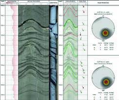 Optical televiewer vs. core image (left) supports structure interpretation and provides depth reference to match core and wireline data; core image used as depth reference in digital core description workspace CoreCAD (right)