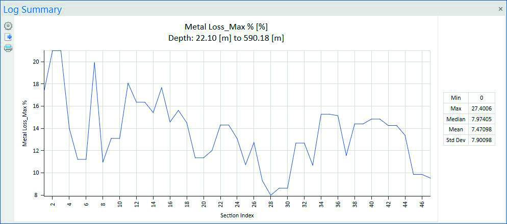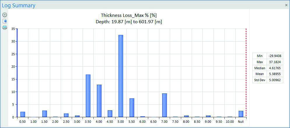 Derived statistics can be plotted against depth, pipe section and as histogram (Figure 9). Columns in the pipe section table can be conditionally filtered.